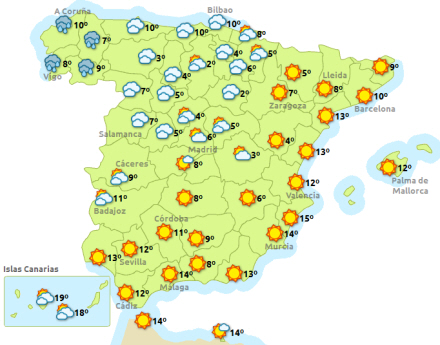 Også svage regnskyl i løbet af dagens første halvdel langs den andalusiske Middelhavskyst , Melilla og på de nordlige egne af De Kanariske Øer. I resten af landet dominerer den skyfri himmel.