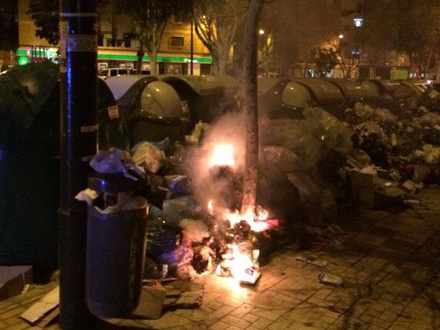 VIDEO: Højspændt situation i Málaga har givet tonsvis af ildelugtende affald i gaderne. I går var der brand i gaderne og anholdelser.