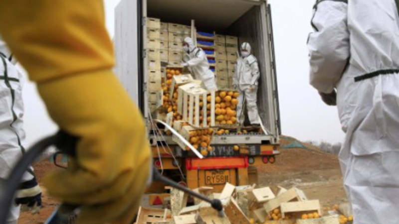 Tirsdag blev omkring 2.000 kasser med appelsiner og citroner fra Spanien destrueret i den kinesiske by Tjanjin, da myndighederne ikke kunne godkende frugterne.