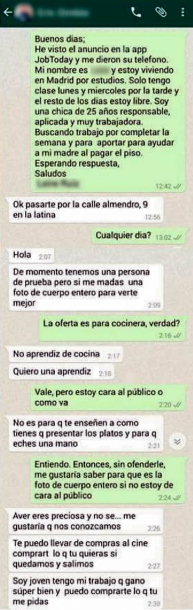 Hun fortæller, at hun studerer i Madrid og leder efter arbejde, så hun kan hjælpe sin mor med at betale husleje. Hun er meget ansvarlig og hårdtarbejdende, skriver hun.