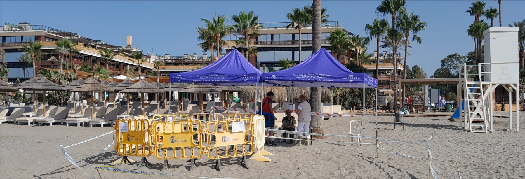Mens eksperter tager sig godt af æggene i zoologisk have i Fuengirola, ligger størstedelen af æggene altså stadig på stranden i Marbella, og her er reden indhegnet og under konstant overvågning - døgnet rundt - på playa Mistral ved Hotel Guadalpín Puerto Banús og Chiringuito Mistral. Og det er frivillige, der hjælper til med det.