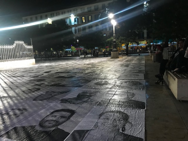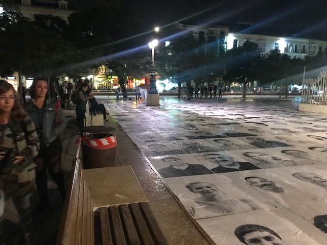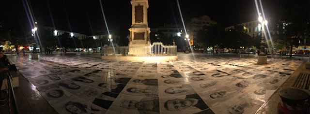 De mange portrætter er blevet klistret til fliserne rundt om den emblematiske obelisk Torrijos-monumentet.