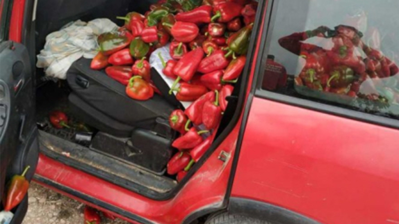 Uden andre hjælpemidler end deres hænder og en rød Opel formåede de at hugge næsten et halvt ton røde pebre.