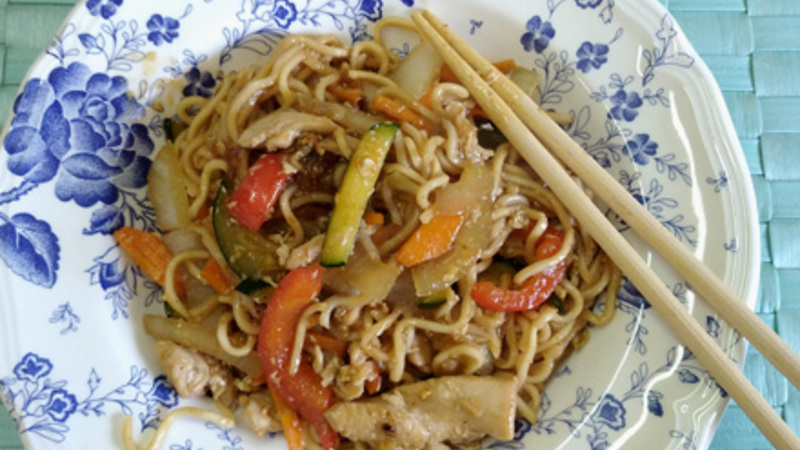 Denne orientalsk-inspirerede ret er meget sund og velsmagende. Samtidig meget alsidig og den kan tilpasses vores smag og andre tilgængelige ingredienser: kylling, oksekød, rejer, krabber eller endda stykker af soja eller sojabønneost for at gøre det helt vegetarisk. Grøntsagerne kan også variere afhængigt af, hvad vi har i køleskabet. Også hvedenudlerne kan ændres til eksemplev: ris- eller majsnudler.