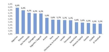 I toppen ligger Algeciras i Cádiz-provinsen, som er kyst kommunen med den højeste rentabilitet med i gennemsnit 6,6 procent efterfulgt af Tortosa i Tarragona-provinsen, som har en gennemsnitlig rentabilitet på 6,4 procent.