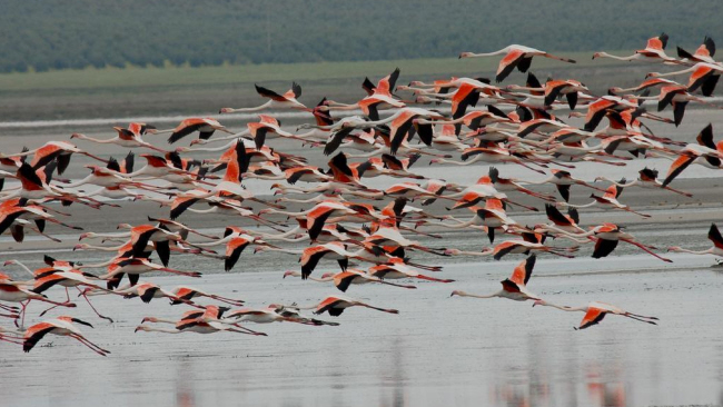 Tusindvis af lyserøde flamingoer nyder den seneste tids regn i søen Laguna de Fuente de Piedra i den nordlige del af Málaga-provinsen,