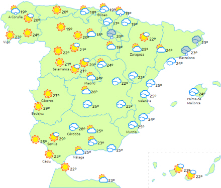 VEJR: I dag er en ret rolig dag vejrmæssigt, hvor kun kystområdet i Girona er i forhøjet alarmberedskab på grund af oprørt hav. Ellers lidt overskyet Middelhavsområdet, langs den nordlige Atlanterhavskyst samt på øerne.