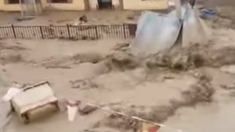 Indbyggerne kunne ikke gøre andet end at se på og filme, mens stormfloden tog både lastbiler og skure med sig gennem byen.