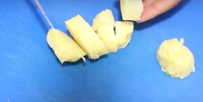 Skyl kartoflerne og kog dem med skrald i en gryde med vand. De skal koges, men ikke for meget. De stikkes med et tandstikker for at se, om de er klar. De pilles og skæres i stykker på ca. 2x2 cm.