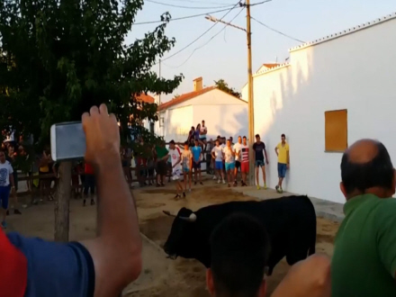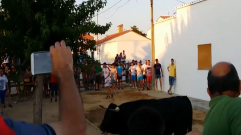 Under tyreløbet til den årlige fest i Valrio prøvede Juan Manuel Calle Sanchez at hoppe over hegnet for at slippe væk fra en tyr. Men manden faldt bagover og lige ind i tyrens favn.
