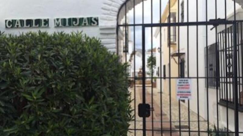 Kvinden blev fundet død her ved rækkehuset i Calle Mijas 30, der har bagudgang til Calle Los Naranjos. Politiets minetape sad der stadig mandag