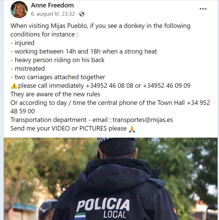 Blandt andet kæmper franske Anne Blitz for, at reglerne bliver overholdt og står bag facebookgruppen 'FREE MIJAS DONKEYS AND HORSES - LIBERAR BURROS Y CABALLOS'. I dag skal hun mødes med repræsentanter for Mjas Byråd for at diskutere, hvad der kan gøres. Hun opfordrer i øvrigt folk til at anmelde det, hvis de ser misrøgt: