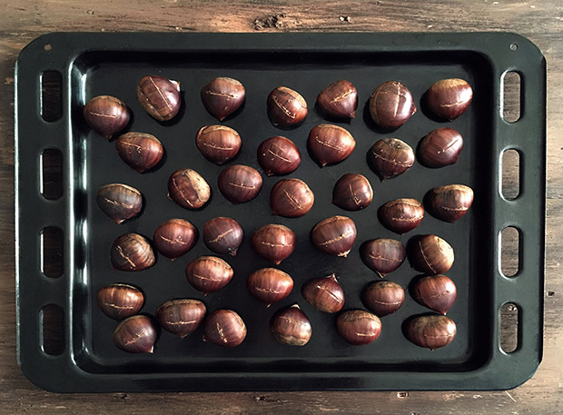 Når du kommer hjem med de skinnende kastanjer, tænder du ovnen på 200 grader. Så tager du din lille grøntsagskniv og går i gang.