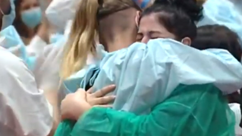 VIDEO: For halvanden måned siden blev Madrids store kongrescenter omdannet til et kæmpe nødhospital for hovedstadens mange smittede. I dag bliver de sidste patienter udskrevet, og det skabte rørende scener i går.