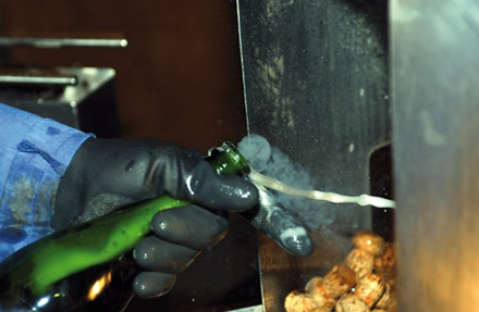 Derefter sættes den endelige prop på plads med metalsikring, etiketten og så er den klar til at blive drukket.