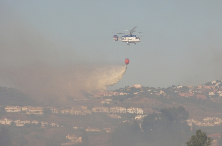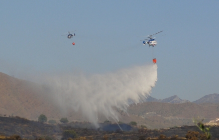 Helikopterne fyldte deres vandkugler fra søen i Mijas Golf og vanddepotet ved avocado-lunden vest for La Cala Hills.