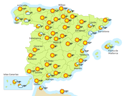 Koldt luft er trængt ind over store dele af landet og selv i den sydligste del af landet kommer der frost. I Murcia er nattemperaturen faldet til minus én grad, og i Andalusien er den nede på minus syv grader i provinserne Jaén og Granada.