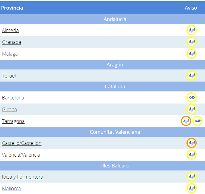 Der vil også komme regn i Andalusien, Aragón og på Balearerne, hvor der er gult varsel i forskellige provinser: