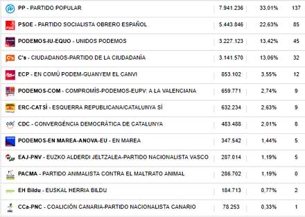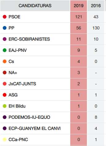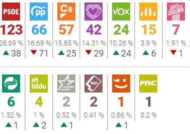 Med 99,65 procent af stemmerne optalt klokken 00:33, blev valgets klare vinder Pedro SáncheZ (PSOE), der fik 123 mandater - en markant stigning fra de hidtidige 85, mens den klare taber blev Pablo Casado (PP), der endte med at få 66 mandater - et styrtdyk fra de 137, som partiet havde i den forrige samling.