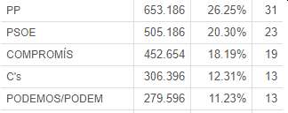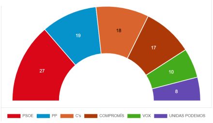 Der var sidst valg til parlamentet i Valencia-regionen - Cortes Valencianas - den 5. juni 2015, hvor fordelingen var således mellem de forskellige partier: