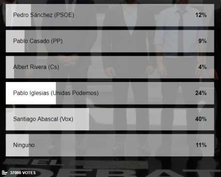 De fem partiledere var Pablo Casado, PP, fungerende premierminister Pedro Sánchez, PSOE, Santiago Abascal, Vox, Pablo Iglesias, Unidos Podemos og Albert Rivera, Ciudadanos