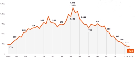 I 2014 var der 223 dødsofre - et fald på 10 fra det foregående år.