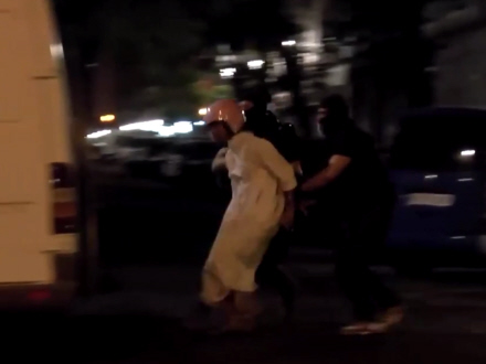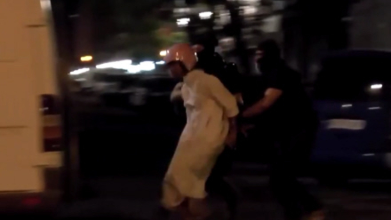 De nåede ikke mange meter ud på gaden, før maskerede politimænd anholdt dem og førte dem væk i en hvid varevogn.
