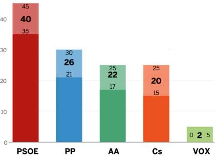 Det hidtidige støtteparti Ciudadanos går kraftigt frem fra de ni nuværende til mellem 20 og 22 mandater, Partiet æder sig ind på PP, der går tilbage fra 33 til mellem 20 og 22 mandater.