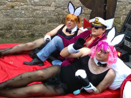 Klædt ud som Playboy-stifteren Hugh Hefner komplet med badekåbe, kaptajnhat og cigar, kørte præsten på en paradevogn gennem Cuntis’ gader.