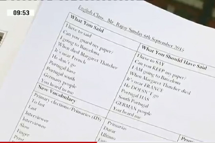 Desværre for premierministeren fangede kameraet et stykke papir, hvor læreren havde skrevet, hvad Rajoy havde sagt, og hvad han skulle have sagt. Det har mange siden moret sig over.