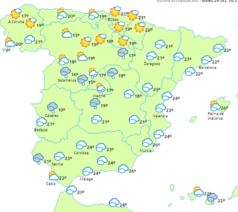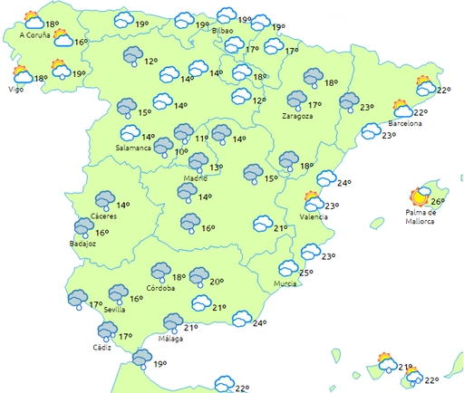 Hele landet får ret skyet vejr, og der kommer regn, muligvis som torden, især i den vestlige del af Andalusien.
