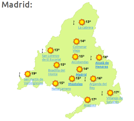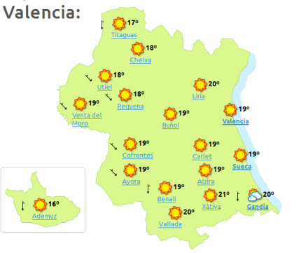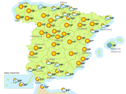 Onsdag stiger temperaturerne i det vestlige Andalusien, mens de falder i de nordlige og indre egne af halvøen og på Balearerne. Højeste temperaturer finder vi i dag i Las Palmas og Santa Cruz de Tenerife med 27 grader, 26 grader i Córdoba og Murcia, mens den kan snige sig op på 25 grader i Granada, Huelva, Málaga og Sevilla.