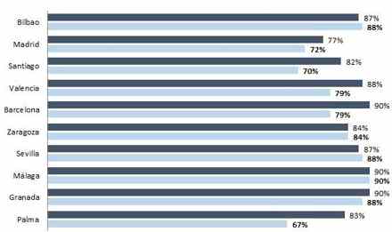 Middelhavets kystområder og De Baleariske Øer er hårdest ramt. Kystområderne taber syv procentpoint og falder til 82, mens øerne falder med 12 procentpoint til 72.