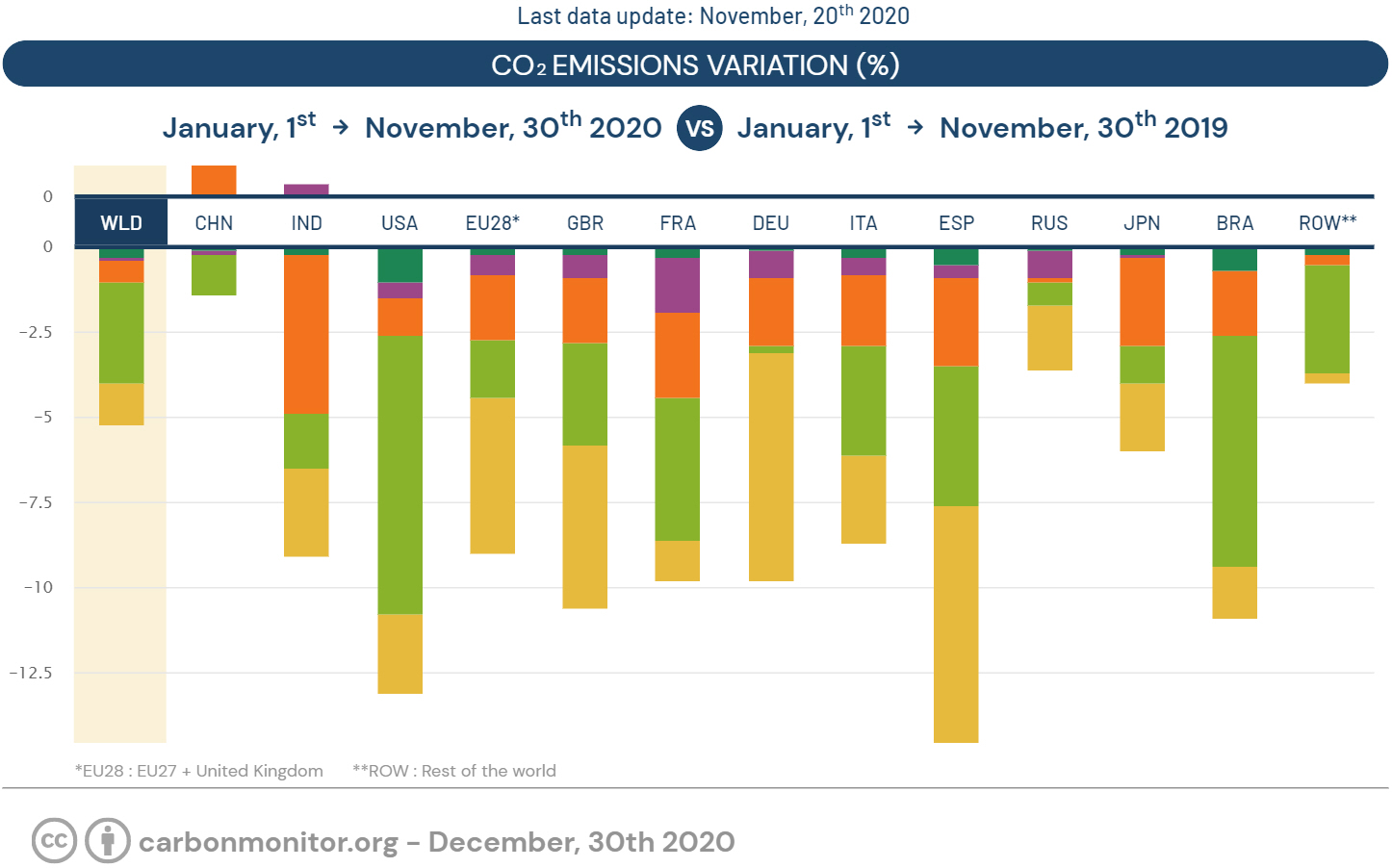 Efter årets første 11 måneder har instituttet Carbon Monitor beregnet, at disse kuldioxidemissioner er faldet med 5,3 procent globalt.