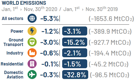 Den største bidragyder til dette fald er reduktionen i landtransport, som er faldet med 15,2 procent i forhold til 2019 og repræsenterer lidt over halvdelen af faldet i de globale emissioner.