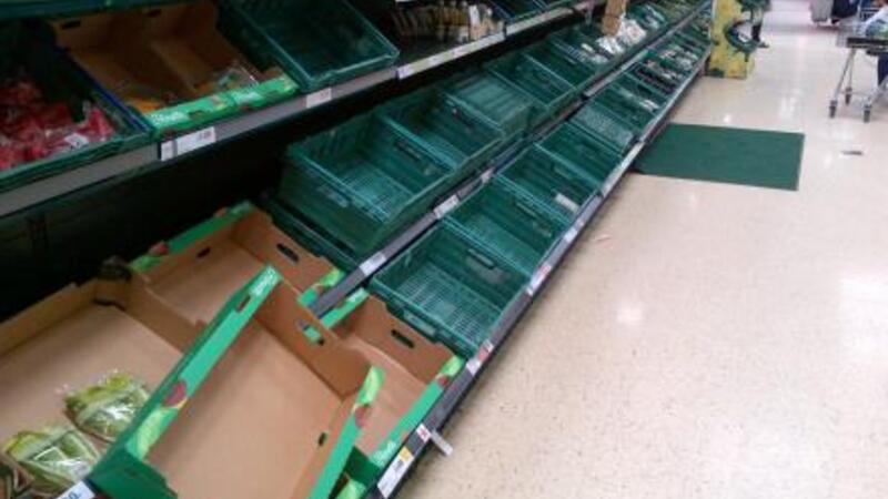 I Tescos butikker fremgår det af skilte på hylderne, at man kun må købe tre hoveder icebergsalat om dagen. Den samme rationering gør sig gældende for broccoli.