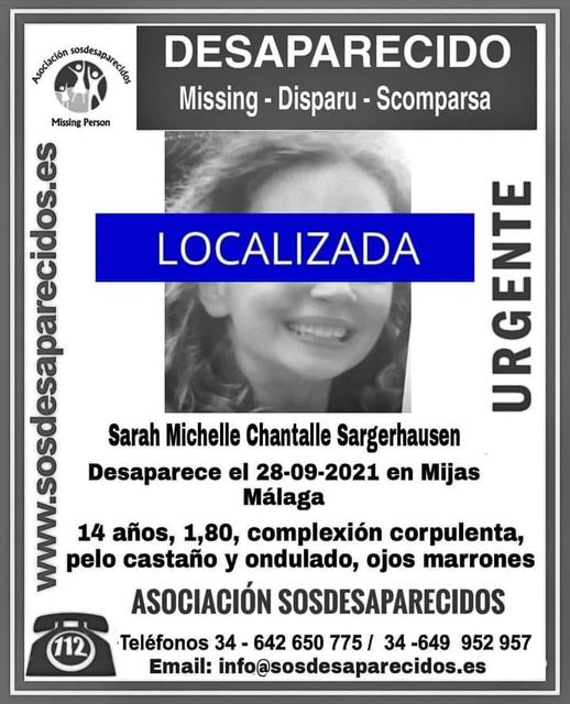 Den 14-årige Sarah Michelle Chantalle Sargerhausen, der forsvandt den 28. september i Mijas, dukkede op lørdag aften i Puerto Banús i Marbella.