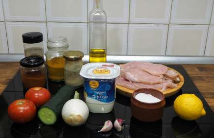 I dag har vi lavet den med kyllingebryst, men den er faktisk mere saftig, hvis den laves med udbenede lår. Lammekød og kalvekød er fra den arabiske opskrift, og den græske version, Gyros, er lavet med svinekød og fetaost.