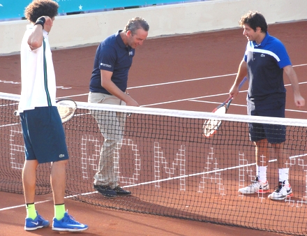 Her trækkes lod om serveretten. Al Aynaoui til venstre, dommeren i midten og Grosjean til højre.
