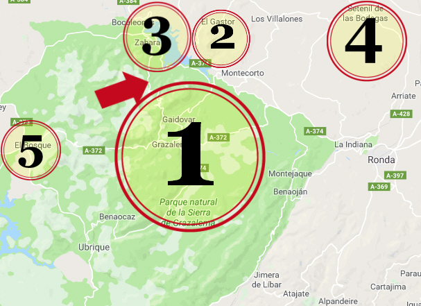 1: Naturparken, 2: El Gastor, 3: Zahara, 4 Setenil de las Bodegas, 5: El Bosque, Pilen: CA-9104