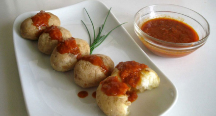 De små kartofler bliver serveret med sovsen Mojo Picón. Ordet stammer fra det portugisiske ord Molho, som betyder sauce.