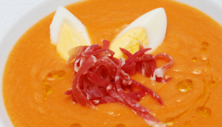 Den færdige, cremede tomatsuppe – som er lidt tykkere i konsistensen end gazpacho - tilsættes små stykker af serrano-skinke og hårdkogte æg.