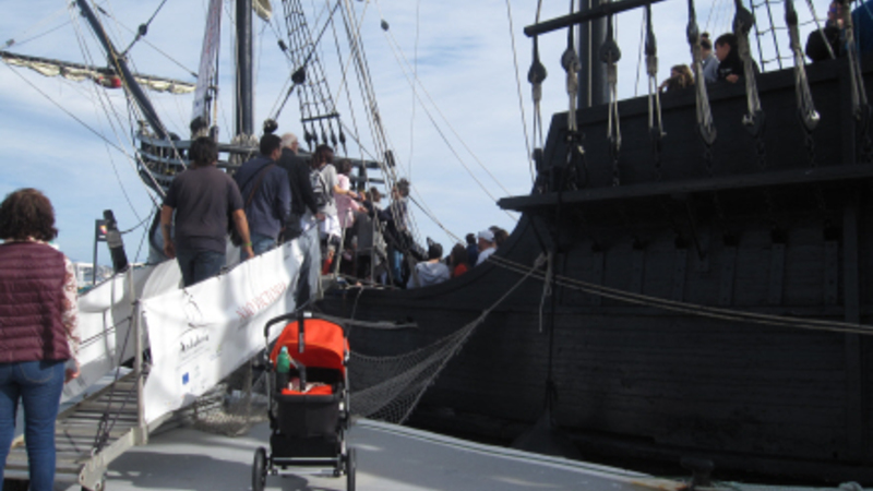 Der var nysgerrige landkrabber i alle aldre, da kopien af galionen Nao Victoria lå ved kaj i Fuengirola i weekenden. Køerne var lange fra tidligt på formiddagen. En enkelt lille gut var iført sørøvertøj fra top til tå, og bedstemødre, der ikke kunne klare at få gangstativet med om over rælingen, ventede tålmodigt i det fine solskinsvejr på kajen.