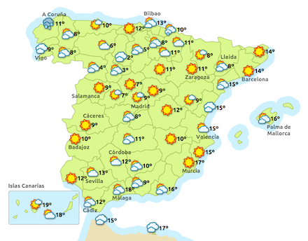 Madrid vågner op til en dag med delvist skyet vejr fra morgenstunden, og ved middagstid vil skyerne være væk. Tilbage er solen og en blå himmel, og sådan fortsætter det til solnedgang. Temperaturen vil kræve huer og halstørklæder, for den vil svinge mellem -2 og 8 grader.