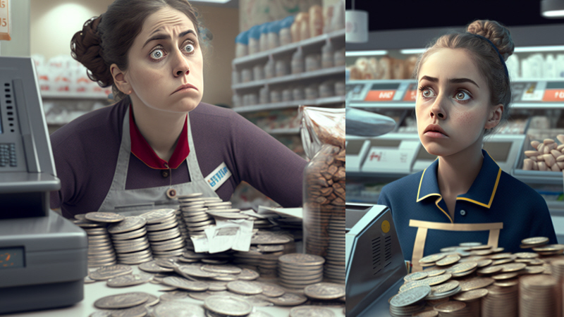 Kassedamen har ikke tid til at tælle alverdens mønter.