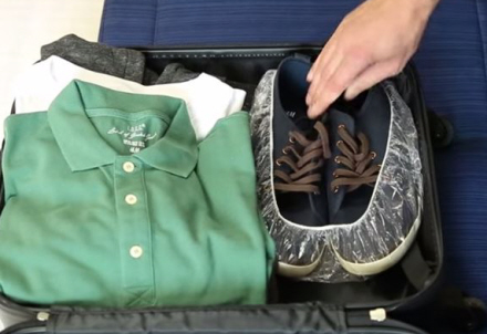 Put dine sko ind i en af de der gratis plastik-hætter, du får på mange hotelbadeværelser. Så slipper du for, at de sviner resten af kufferten til, og det fylder meget mindre end en hel plastikpose.