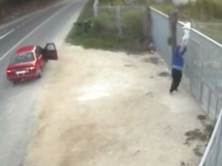 VIDEO: Politiet jagter to mænd, som blev filmet af et overvågningskamera, da de smed en lille hvalp over hegnet til et dyreinternat, inden de stak af.
