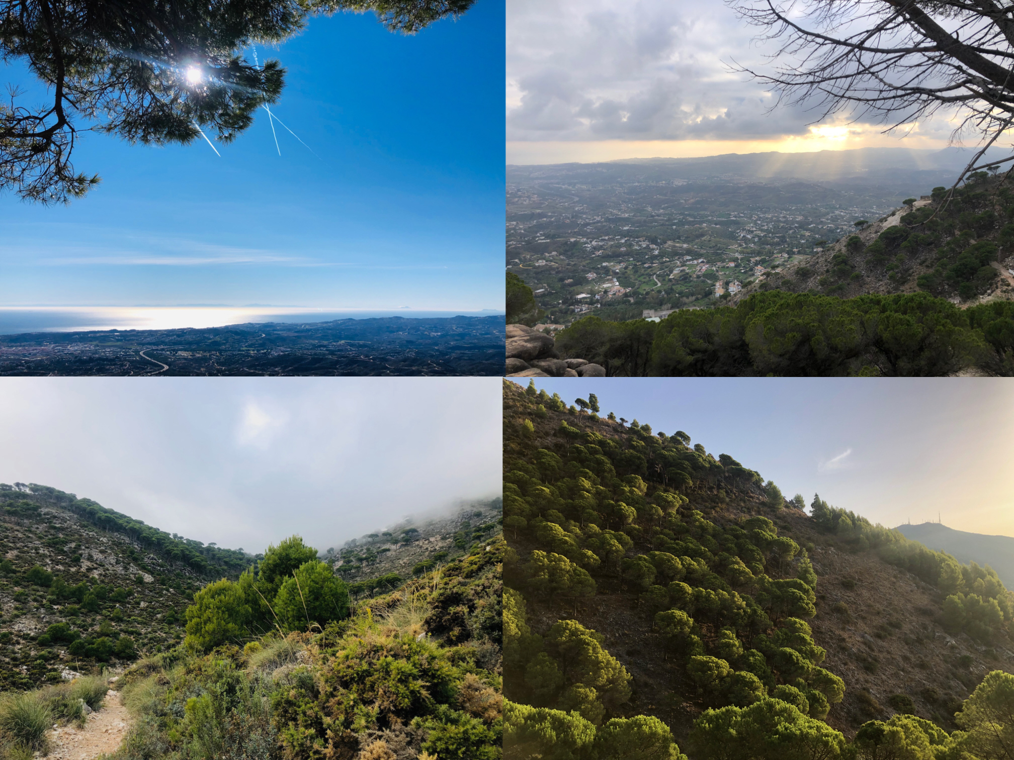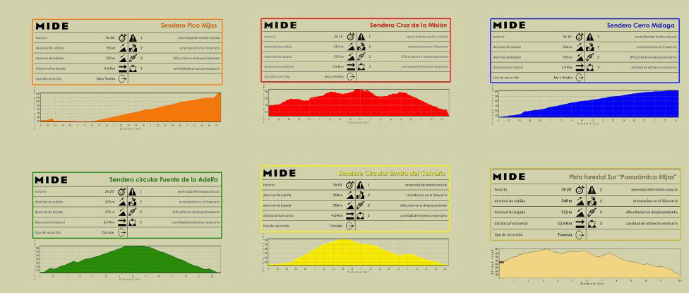 På bjerget lige oven over turistperlen Mijas Pueblo er der seks forskellige ruter at vælge imellem og to forskellige steder, man kan starte fra. Så kan man for eksempel vælge at gå lidt af den orange, indtil man rammer den lysegule og fortsætte ad den, indtil man rammer den grønne og så gå tilbage til udgangspunktet ad den.