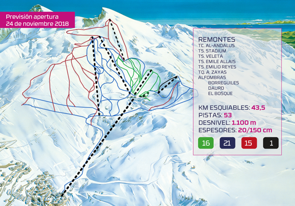 Ifølge data fra Cetursa kan folk gå direkte i kast med pister i Borreguiles, Veleta, El Río og Loma de Dílar - sidstnævnte er kun punktvis farbar.