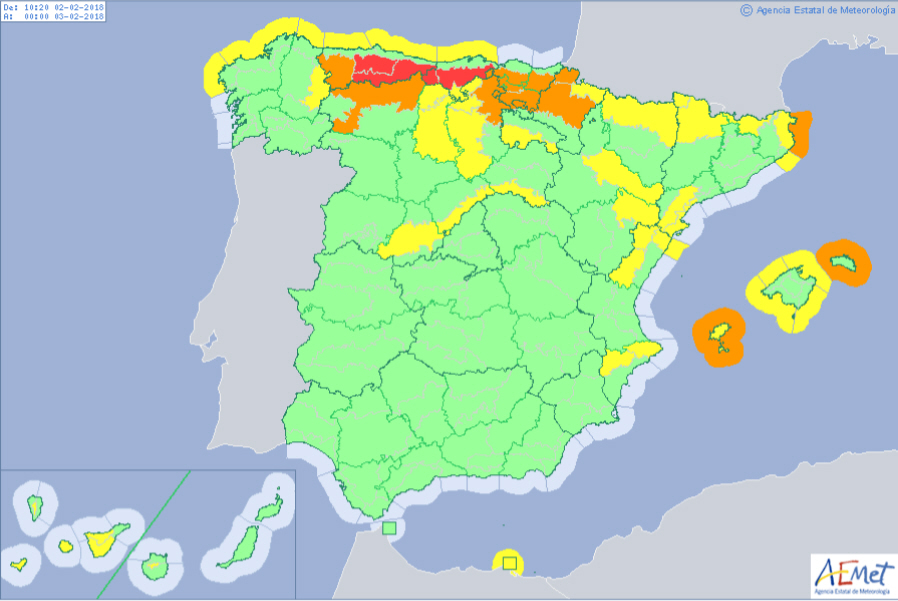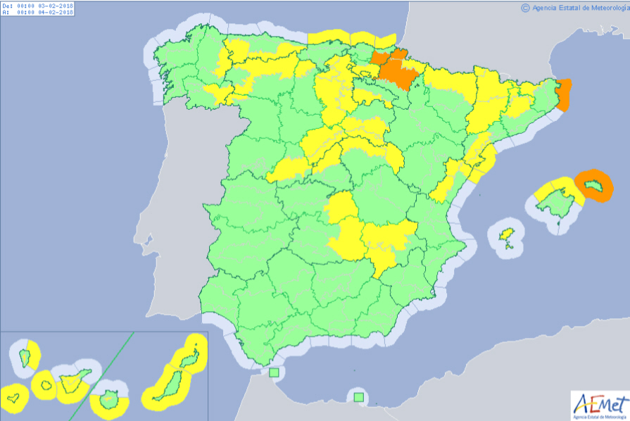 Meteorologisk Institut, Aemet, har udstedt varsel om snefald frem til søndag.